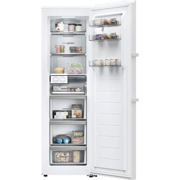Congélateur armoire Haier H4F306WDH1 blanc - Sa capacité nette de 301 litres offre un volume généreux pour stocker les produits surgelés d’un foyer et mieux organiser les achats en quantité - Le froid No Frost évite la formation de givre, préserve la capacité utile et supprime la corvée de dégivrage - La fonction super congélation aide à refroidir plus vite les aliments nouvellement chargés, l’alarme de température sécurise la conservation et la connectivité permet le pilotage à distance ainsi que la création d’un inventaire - Conçu pour fonctionner jusqu’à -15 °C dans une pièce non chauffée, il apporte une solution pratique pour un cellier, un garage ou une dépendance - L’éclairage LED améliore la visibilité du contenu, les 3 clayettes, les 3 tiroirs transparents et les 3 balconnets contre-porte facilitent le rangement par catégories, tandis que le twist ice maker ajoute un usage pratique au quotidien - La régulation électronique permet un réglage précis sans perte de froid inutile à l’ouverture, avec interface de contrôle électronique et porte réversible pour une implantation plus souple - Son format de 190 x 60 cm et son coloris blanc en font un appareil facile à intégrer dans de nombreux espaces.