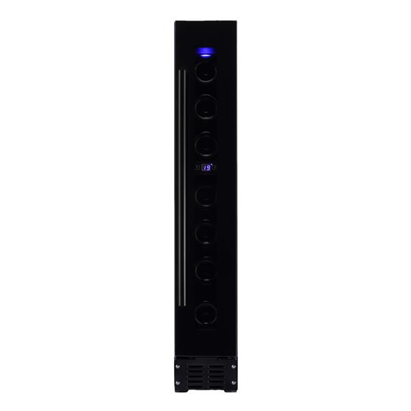 Cave à vin - Encastrable sous plan - Ultra compacte et conçue pour accueillir jusqu’à 7 bouteilles, cette cave encastrable est parfaite pour conserver vos vins préférés à la température idéale - Son amplitude de +5°C à +22°C s’adapte à tous les types de vins - Le froid ventilé garantit une température homogène - Le contrôle sensitif avec affichage digital LED bleu permet un réglage simple et précis - L’éclairage LED bleu intérieur, activable par interrupteur, sublime vos bouteilles au quotidien - Le modèle accepte les formats Alsace et Bordeaux - Esthétique et fonctionnelle, sa porte vitrée noire est équipée d’un triple vitrage anti-UV pour protéger vos crus - Elle est réversible avec poignée inox montée d’origine et une poignée noire fournie - Le système anti-vibration assure une conservation optimale - Avec ses 88 cm de hauteur, elle s’intègre discrètement dans une niche dédiée.