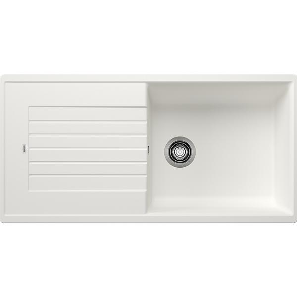 Pack évier et mitigeur BLANCO ZIA XL 6 S SILGRANIT blanc et MIDA chromé - Cet ensemble associe une cuve XL et un mitigeur au bec haut pour offrir un espace de lavage confortable et cohérent en design - La grande cuve XL apporte un volume appréciable pour nettoyer les plats volumineux et manipuler facilement les ustensiles encombrants au quotidien - L’égouttoir intégré permet de poser et laisser sécher la vaisselle directement après lavage, tout en gardant un plan de travail organisé - L’installation réversible facilite l’adaptation à la configuration de la cuisine et sécurise le choix lors de la pose - Le mitigeur MIDA est équipé d’un bec orientable à 360°, offrant une liberté de mouvement totale pour rincer efficacement chaque zone de la cuve - Son bec haut et courbé simplifie le remplissage des carafes et des grands récipients, tout en valorisant l’esthétique du point d’eau - La cartouche à disques céramiques assure un réglage précis et fluide du débit et de la température pour un usage confortable au quotidien - Le régulateur de jet limite nettement les dépôts de calcaire et contribue à préserver la qualité du jet dans le temps - Le système d’écoulement compact avec crépine 3 ½'' optimise l’espace sous l’évier et libère du volume pour le rangement.