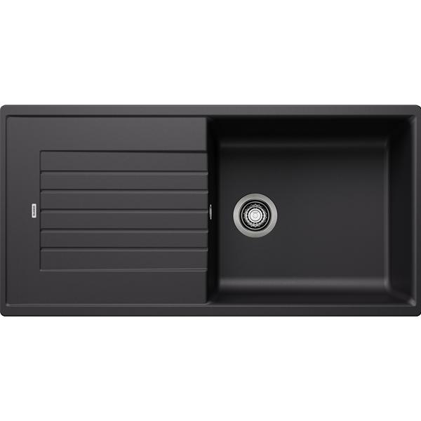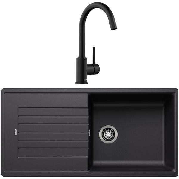 Pack évier et mitigeur BLANCO ZIA XL 6 S SILGRANIT noir et MIDA noir mat - Cet ensemble coordonné crée un espace de lavage homogène et contemporain, pensé pour un usage quotidien confortable - La cuve XL offre un volume généreux pour nettoyer facilement les plats volumineux, les plaques de cuisson et les grands ustensiles sans contrainte - L’égouttoir intégré permet de déposer la vaisselle lavée ou les aliments rincés, contribuant à garder un plan de travail organisé - L’agencement réversible facilite l’adaptation à la configuration de la cuisine et sécurise le choix à l’installation - Le mitigeur MIDA dispose d’un bec haut et courbé qui simplifie le remplissage des carafes et récipients de grande taille - Son bec orientable à 360° assure un large rayon d’action et permet de rincer efficacement chaque zone de la cuve - La cartouche à disques céramiques garantit un réglage précis et fluide du débit et de la température pour un confort d’utilisation constant - Le régulateur de jet limite les dépôts de calcaire et participe à la durabilité du jet dans le temps - Le système d’écoulement compact avec crépine 3 ½'' optimise l’espace sous meuble et laisse davantage de place pour le rangement - La finition noire du SILGRANIT associée au noir mat du mitigeur renforce le caractère graphique du point d’eau et s’intègre naturellement dans les cuisines actuelles.