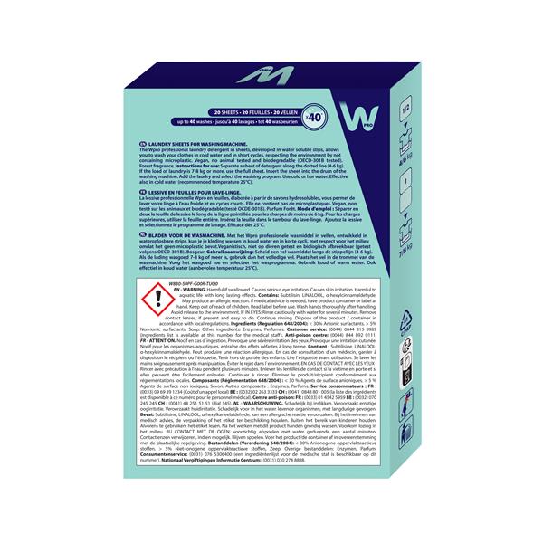Lessive en feuilles Wpro LDS025 - Cette lessive innovante se présente sous forme de bandes hydrosolubles prédosées pensées pour simplifier le lavage au quotidien - Elle se dissout en quelques secondes seulement et convient aussi bien aux cycles courts qu’aux lavages à basse température, y compris à l’eau froide recommandée à 25 °C - Le dosage précis limite le gaspillage et évite toute surconsommation, tout en garantissant une efficacité constante quelle que soit la charge de linge - Utilisable en lave-linge comme pour le lavage à la main, elle s’adapte à tous les types de textiles et à tous les programmes - Sa formule sans microplastiques, composée jusqu’à 75 % d’ingrédients d’origine végétale, est biodégradable selon la norme OCDE-301B - Vegan et non testée sur les animaux, elle répond aux attentes des consommateurs attentifs à l’impact environnemental de leurs achats - Son format ultra-compact permet un gain de place notable à la maison comme en déplacement, tout en restant facile à stocker et à transporter - Chaque boîte contient 20 feuilles pouvant aller jusqu’à 40 lavages selon la charge de linge - Le parfum forêt apporte une sensation de fraîcheur discrète et agréable après chaque lavage.