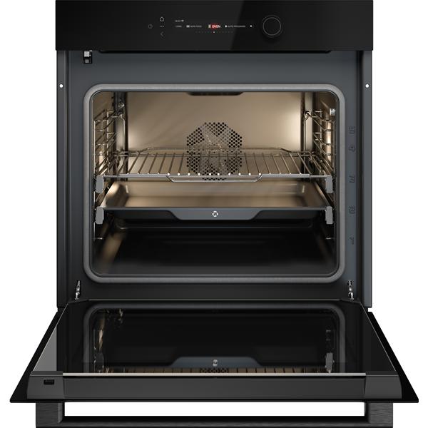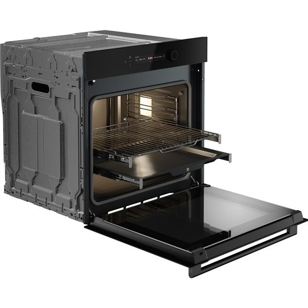 Four pyrolyse ASKO OTP56BGH série 5 Craft Glass coloris noir satiné - Les commandes associent un écran tactile couleur TFT 6 pouces et une molette multifonction pour accéder rapidement aux réglages et ajuster précisément les paramètres de cuisson - Ce modèle propose 23 fonctions incluant chaleur tournante, chaleur voûte et sole, gril, Air Fry et programmes dédiés pour couvrir l’ensemble des usages du quotidien - La connectivité ConnectLife permet la surveillance et le contrôle à distance pour plus de souplesse d’utilisation - Les 112 programmes automatiques facilitent la réussite des recettes en adaptant automatiquement température et durée selon le plat sélectionné - La sonde de cuisson mesure la température à cœur pour atteindre avec précision le résultat souhaité, utile pour les rôtis, volailles ou cuissons délicates - La fonction de calibration garantit une correspondance précise entre température réglée et température réelle avec un écart maximal de ±1 °C pour une cuisson maîtrisée - Le flux d’air à 360° assure une répartition homogène de la chaleur sur 5 niveaux, pratique pour cuire plusieurs préparations simultanément - Le préchauffage rapide permet de réduire le temps d’attente avant enfournement - L’équipement comprend un éclairage latéral à différentes hauteurs et une porte tempérée avec refroidissement actif - Les accessoires fournis incluent une grille, deux lèchefrites et un kit rails télescopiques totalement extensibles sur un niveau - Panier AirFry fourni en option (référence 907744).