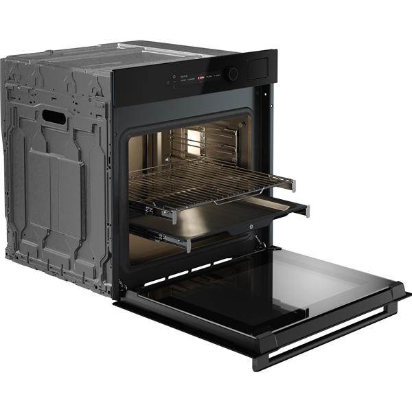 Four combiné à vapeur ASKO OCS56BGH série 5 Craft coloris noir satiné - Les commandes associent un écran tactile couleur TFT 6 pouces et une molette multifonction pour naviguer avec précision dans les menus et ajuster facilement les paramètres de cuisson - Ce modèle propose 30 fonctions incluant chaleur tournante, vapeur, sous-vide, Air Fry et modes combinés pour couvrir l’ensemble des usages du quotidien aux préparations plus élaborées - La connectivité ConnectLife permet la surveillance et le contrôle à distance pour plus de confort et de flexibilité - La vapeur réglable de 30 à 100 °C préserve le moelleux, les saveurs et les qualités nutritionnelles, idéale pour poissons, légumes ou régénération sans dessèchement - Les 123 programmes automatiques facilitent la réussite des recettes en adaptant automatiquement température et durée selon le plat sélectionné - La sonde culinaire mesure la température à cœur pour obtenir une cuisson précise des viandes et préparations délicates - La fonction de calibration garantit une correspondance fiable entre température réglée et température réelle avec un écart maximal de ±1 °C - Le flux d’air à 360° assure une répartition homogène de la chaleur et de la vapeur sur plusieurs niveaux pour cuire simultanément avec régularité - Le préchauffage rapide réduit le temps d’attente avant enfournement - L’équipement comprend un éclairage latéral à différentes hauteurs, un réservoir d’eau de 1,2 l, des rails télescopiques totalement extensibles sur un niveau et une porte tempérée avec refroidissement actif - Les accessoires fournis incluent une grille, un bac vapeur perforé, un bac vapeur non perforé, deux lèchefrites et une sonde culinaire - Panier AirFry fourni en option (référence 907744).