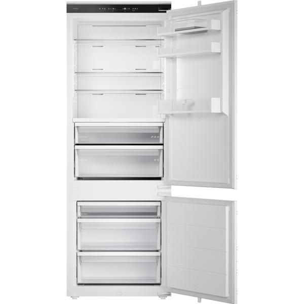 Réfrigérateur combiné ASKO RBC297SND1 largeur 71 cm - Capacité totale de 371 litres dont 232 litres pour la partie réfrigérateur, 35 litres dédiés aux tiroirs et 104 litres pour le congélateur, offrant un espace généreux pour stocker aliments frais et surgelés dans une cuisine familiale - Froid ventilé total NoFrost dans le réfrigérateur et le congélateur pour éviter la formation de givre, garantir une température homogène et supprimer la corvée de dégivrage - Fonction Super Cool manuelle et Super Freeze pour refroidir ou congeler rapidement après les courses et préserver la texture ainsi que la qualité des aliments - Système Opti Flow avec ventilation continue, contrôle adaptatif de la température et régulation automatique de l’humidité pour stabiliser les conditions de conservation et limiter le dessèchement des produits sensibles - Deux tiroirs Nordic Fresh dédiés aux fruits, légumes, viandes et poissons pour organiser les denrées selon leurs besoins spécifiques - Bandeau LED latéral pour un éclairage clair du compartiment réfrigérateur - Trois clayettes en verre amovibles, deux balconnets, un bac Multi Box pour fromage et beurre, un compartiment à bouteilles avec cale coulissante et trois tiroirs de congélation pour un rangement structuré et accessible - Écran LED à icônes, connexion Wi-Fi via l’application ConnectLife, alarmes porte ouverte et température élevée ainsi que modes Éco, Fête, Vacances et Sabbat pour adapter le fonctionnement au quotidien - Hauteur de niche 1940 à 1945 mm avec fixation par glissières et porte réversible droite/gauche - Cet appareil est intégrable. Il est livré sans habillage ni porte décorative, afin de vous permettre de l'assortir au mobilier et à la couleur de votre cuisine.