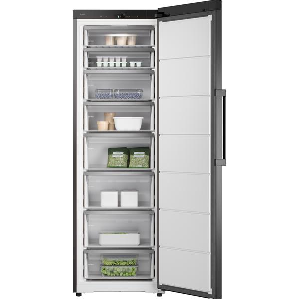 Réfrigérateur 1 porte pose libre ASKO RFR586KNCB1 inox noir brossé Black Steel - Capacité totale de 370 litres dont 260 litres pour le réfrigérateur et 110 litres dédiés aux tiroirs, offrant un volume généreux pour organiser facilement les produits frais et les préparations familiales - Refroidissement ventilé avec système Opti Flow+ assurant une circulation continue de l’air dans la cavité et les tiroirs Dura Fresh pour maintenir une température homogène et limiter les variations - Fonction Super Cool manuelle idéale après les courses pour abaisser rapidement la température et préserver la fraîcheur des aliments sensibles - Contrôle adaptatif de la température et gestion automatique de l’humidité pour stabiliser les conditions de conservation et prolonger la tenue des fruits, légumes, viandes et poissons - Trois tiroirs Dura Fresh avec réglages de température séparés dont un dédié aux viandes et poissons et deux aux fruits et légumes pour adapter précisément chaque zone aux besoins réels - Ruban LED latéral et bande LED sous la tablette de séparation pour un éclairage uniforme et confortable - Cinq clayettes en verre dont quatre amovibles, trois balconnets, deux conteneurs à bouteilles avec butoirs d’arrêt, Multi Box avec couvercle en bois et grand plateau coulissant intérieur/extérieur en bois pour un rangement structuré et accessible - Écran TFT couleur 2,86'', connexion Wi-Fi via l’application ConnectLife avec mises à jour FOTA, modes Éco, Fête, Vacances et Sabbat, alarmes porte ouverte et température élevée pour un pilotage précis au quotidien - Coloris inox noir brossé Black Steel et design Kitchen Fit avec roulettes et pieds réglables pour une installation facilitée.