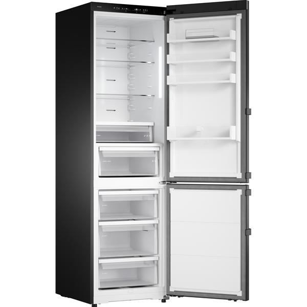 Réfrigérateur combiné pose libre ASKO RFC226RNBB1 inox noir brossé Black Steel - Capacité totale de 409 litres dont 200 litres pour le réfrigérateur, 79 litres dédiés aux tiroirs réfrigérateur et 130 litres pour le congélateur, offrant un grand volume pour organiser produits frais et surgelés pour toute la famille - Froid ventilé total NoFrost dans le réfrigérateur et le congélateur pour éviter la formation de givre, maintenir une température homogène et supprimer le dégivrage manuel - Fonctions Super Cool et Super Freeze idéales après les courses pour refroidir ou congeler rapidement de grandes quantités d’aliments et préserver leurs qualités - Système Opti Flow et contrôle adaptatif de la température associés à une gestion automatique de l’humidité pour stabiliser les conditions de conservation et limiter le dessèchement - Bandeau LED latéral pour un éclairage clair du compartiment réfrigérateur - Quatre clayettes en verre, trois balconnets, un compartiment à bouteilles avec cale coulissante, deux tiroirs Nordic Fresh côté réfrigérateur et trois tiroirs côté congélateur pour un rangement structuré et accessible - Affichage numérique de la température pour le réfrigérateur et le congélateur avec écran LED à icônes pour un réglage précis et lisible - Alarmes porte ouverte et température élevée pour sécuriser la conservation des aliments - Coloris inox noir brossé Black Steel avec roulettes et pieds réglables pour faciliter l’installation et l’intégration dans la cuisine.