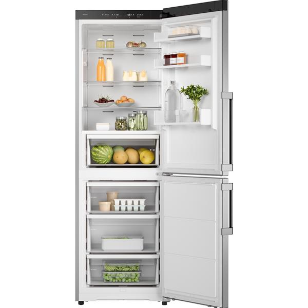 Réfrigérateur combiné pose libre ASKO RFC286KNBS1 inox - Capacité totale de 324 litres dont 168 litres pour le réfrigérateur, 42 litres pour les tiroirs réfrigérateur et 114 litres pour le congélateur, offrant un volume équilibré pour organiser efficacement produits frais et surgelés - Froid ventilé total NoFrost dans le réfrigérateur et le congélateur pour éviter la formation de givre, garantir une température homogène et supprimer le dégivrage manuel - Fonctions Super Cool et Super Freeze idéales après les courses pour refroidir ou congeler rapidement de grandes quantités d’aliments et préserver leur qualité - Système Opti Flow associé au contrôle adaptatif de la température et à la régulation automatique de l’humidité afin de stabiliser les conditions de conservation et limiter le dessèchement des fruits et légumes - Bandeau LED latéral assurant un éclairage clair et uniforme du compartiment réfrigérateur - Trois clayettes en verre dont deux amovibles, deux balconnets, un compartiment à bouteilles avec cale coulissante et trois tiroirs de congélation pour un rangement structuré et accessible - Écran LED à icônes avec connexion Wi-Fi via l’application ConnectLife, modes Éco, Fête, Vacances et Sabbat ainsi qu’alarmes porte ouverte et température élevée pour un pilotage précis et sécurisé - Coloris inox avec roulettes et pieds réglables pour faciliter l’installation et l’adaptation à l’espace disponible.