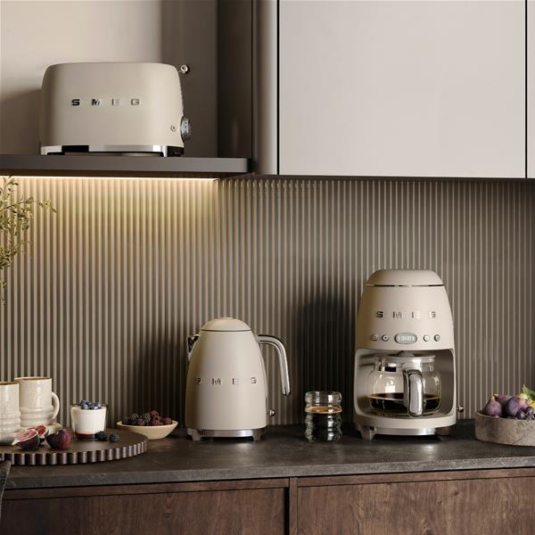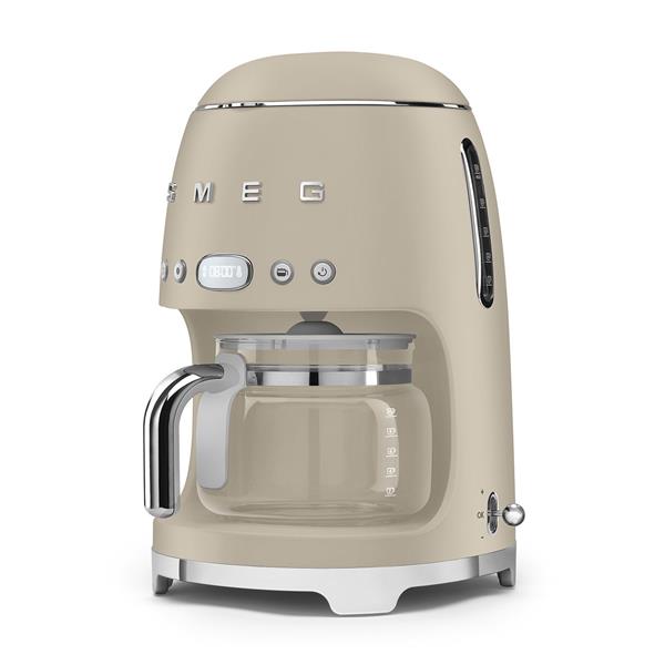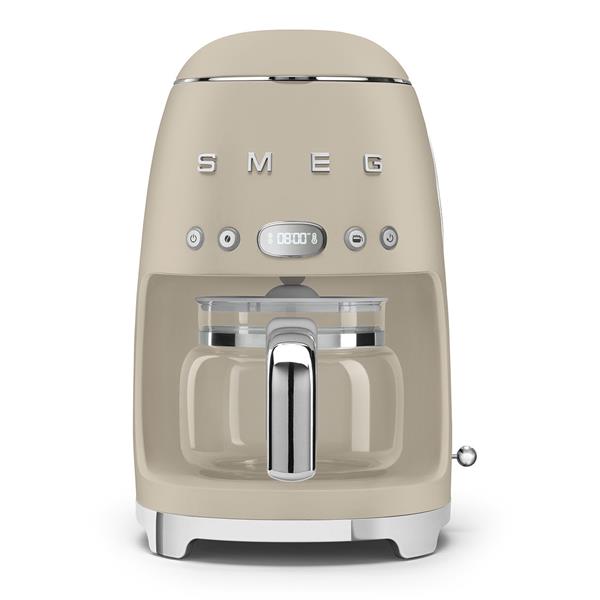 Cafetière filtre Smeg DCF02MLMEU - Avec son esthétique Années 50 et sa finition mate Beige lin, elle associe design iconique et performance moderne - Sa puissance de 1050 W et son système de chauffe par résistance électrique assurent une extraction homogène pour jusqu’à 10 tasses grâce à sa carafe en verre de 1,25 l et son réservoir d’eau de 1,4 l - L’intensité du café est réglable sur 2 niveaux léger ou intense afin d’adapter l’arôme selon les préférences - La fonction 4 tasses optimise la préparation des petites quantités sans altérer le goût - Programmable avec allumage automatique et maintien au chaud 40 minutes, elle s’intègre parfaitement au rythme quotidien - Dotée d’un système anti gouttes, d’une base antidérapante et d’une alarme de détartrage, elle combine confort d’utilisation et entretien maîtrisé.