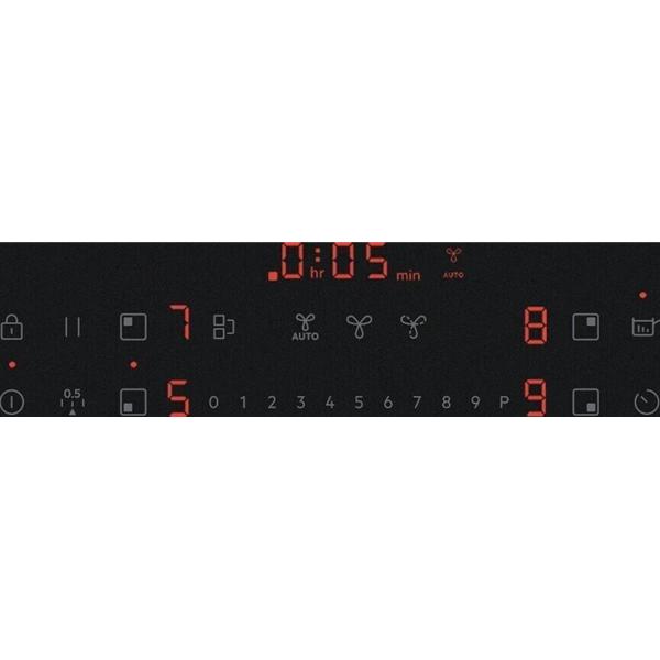 Matière : verre vitrocéramique Foyer Induction : 4 Foyer(s) droit : Av 14,5/2,5 _ AR 18/2,8 cm/kW Foyer(s) gauche : AV 21/3,2 _ AR 21/3,2 cm/kW Débit : 630 m3/h Niveau sonore : 66 dB