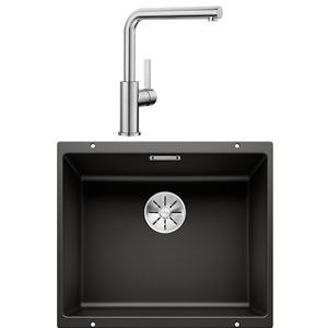 Pack évier et mitigeur BLANCO SUBLINE 500-U SILGRANIT noir et LANORA inox brossé - Cet ensemble associe une cuve sous plan au design épuré et un mitigeur en inox massif pour créer un point d’eau haut de gamme et cohérent - La cuve SUBLINE 500-U se distingue par sa géométrie élégante et son rayon d’angle réduit de 10 mm, permettant de maximiser le volume utile pour le lavage quotidien - L’installation sous plan libère totalement le plan de travail et facilite l’entretien en évitant les rebords apparents - Le système d’évacuation InFino avec bonde à panier Ø 90 mm et trop-plein C-overflow, élégamment intégrés, simplifie le nettoyage et assure une finition soignée - Le siphon inclus optimise l’organisation sous meuble - Le mitigeur LANORA en inox massif brossé apporte robustesse et esthétique contemporaine - Son bec haut facilite le remplissage des casseroles et vases, améliorant le confort d’utilisation - Le bec orientable à 360° offre un large rayon d’action pour rincer efficacement toute la cuve - La position de base du levier sur eau froide contribue à limiter la consommation d’eau chaude lors des usages courants - Son levier vertical permet une installation possible contre un mur, offrant davantage de liberté d’aménagement.