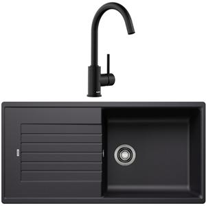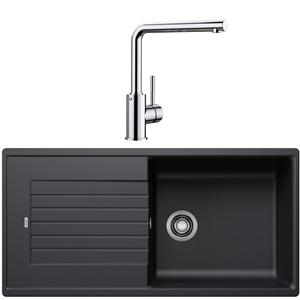 Pack évier + mitigeur - Evier à encastrer LEGRA XL 6S : 1 cuve + égouttoir - Finition Silgranit® noir - Vidage compact avec bonde à panier Ø 90 mm inox manuelle - Siphon inclus - Pour sous-meuble de 60 cm. Mitigeur MIDA-S : Col de cygne orientable à 360° avec douchette amovible - Hauteur 33,6 cm - Finition noir mat.