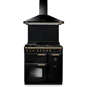 Piano de cuisson KITCHENER 90 - Largeur 90 cm - Four de gauche catalyse 79 litres à chaleur tournante (Triple résistance annulaire - LxHxP = 467 x 438 x 385 mm - Label énergie A - Eclairage - Etagère Handyrack - Programmable) - Four de droite 67 L émail lisse à chaleur tournante (LxHxP = 297 x 577 x 389mm) - Four gril séparé 21 litres (LxHxP = 370 x 145 x 380 mm) avec plateau coulissant et grille 2 positions (Fonctions Décongélation, Réchauffage ou Gril). Table de cuisson comprenant 5 brûleurs dont 1 triple-couronne 4 kW (support pour Wok en option) - Porte-casserole en fonte - Allumage électronique - Coloris noir + finition chrome.