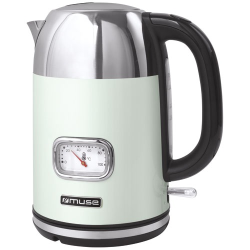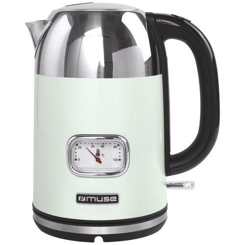 Bouilloire 1,7 L sans fil avec socle 360° de style rétro - Collection of Inspiration - Découvrez cette nouvelle bouilloire qui prendra facilement sa place dans votre cuisine - Élégante et de grande capacité, elle répondra rapidement à vos besoins d'eau chaude - Corps en acier inoxydable 304 - Indicateur de température avec affichage sur cadran à aiguille - Arrêt automatique - Filtre antitartre amovible et lavable - Indication du niveau d'eau - Bec en V pour verser et remplir facilement - Poignée ergonomique pour une prise en main agréable - Interrupteur lumineux - Coloris Vert d'eau & Inox - Puissance 2200 W - Garantie 2 ans.