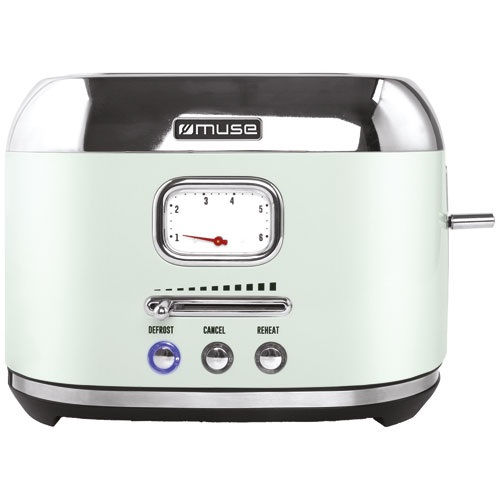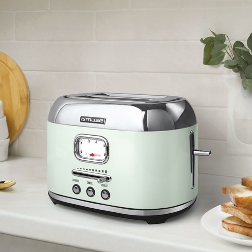 Grille-pain de style rétro 2 fentes - Collection of Inspiration - Du pain parfaitement grillé pour vos petits-déjeuners ou vos brunch ! - 6 niveaux de brunissement pour un pain uniformément grillé des 2 côtés, avec fonction d'annulation - Fonctions Décongélation et Réchauffage - Remontée extra-haute : surélévation pour un retrait des petites tranches en toute sécurité - Tiroir ramasse-miettes amovible pour un nettoyage facile - Enrouleur du cordon alimentation - Arrêt automatique - En acier inoxydable et galvanisé - Coloris Vert d'eau & Inox - Puissance 1000 W - Garantie 2 ans.