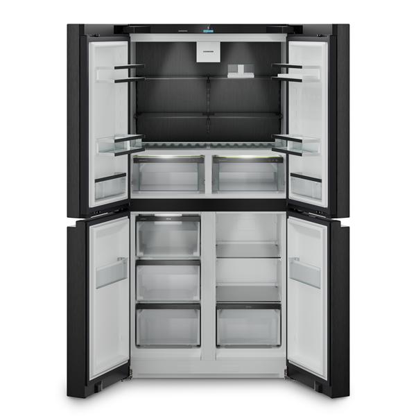 Réfrigérateur 4 portes Liebherr MBbsdi 9024 - Ce modèle 4 portes combine design haut de gamme et technologie avancée pour un confort quotidien optimal - Avec un volume total de 572 L, il offre un vaste espace de stockage réparti entre un réfrigérateur de 253,5 L, une zone BioFresh de 100,2 L et un congélateur de 219 L - Le froid brassé PowerCooling FreshAir garantit une température homogène dans tout l’appareil, tandis que le froid No-Frost du congélateur évite la formation de givre - Les tiroirs BioFresh montés sur rails SoftTelescopic assurent une conservation idéale des fruits, légumes, viandes et poissons à une température proche de 0 °C - IceMaker avec branchement fixe à l'eau - La zone VarioTemp permet d’ajuster la température de -18 °C à +5 °C pour s’adapter à tous les besoins - L’éclairage LED intérieur et BioFresh assure une visibilité parfaite sur chaque niveau - L’écran tactile TFT couleur 2,4'' permet une régulation électronique intuitive - Compatible Smart Home, ce réfrigérateur connecté se pilote via l’application (SmartDeviceBox fournie) - Son design BlackSteel (portes et côtés) et son faible niveau sonore de 39 dB en font un appareil élégant et silencieux.