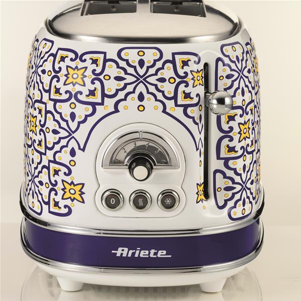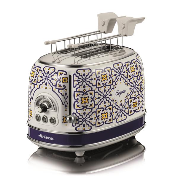 Grille-pain Ariete Capri 2 fentes 0155/1C conçu pour griller le pain efficacement tout en apportant une forte identité méditerranéenne à la cuisine - Grâce à ses 2 compartiments séparés et à une puissance de 810 W, il permet de griller jusqu’à 2 tranches simultanément avec une montée en température rapide et homogène - Les 6 niveaux de brunissage offrent un réglage précis pour obtenir un pain légèrement doré ou plus croustillant selon les préférences - Les fonctions chauffage, arrêt et décongélation élargissent les usages, permettant de réchauffer ou de décongeler le pain directement sans accessoire supplémentaire - L’éjection automatique sécurise la récupération des tranches en fin de cycle et limite les risques de brûlure - Les parois froides améliorent la sécurité pendant l’utilisation, même en environnement familial - Le tiroir ramasse-miettes amovible facilite le nettoyage et contribue à maintenir un plan de travail propre - Son design Capri aux motifs décoratifs inspirés de l’île italienne transforme un appareil du quotidien en véritable objet décoratif.