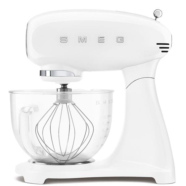 Robot sur socle SMEG SMF15WHEU - Avec son design Années 50 et sa finition blanc brillant, ce robot sur socle entièrement coloré apporte une vraie présence sur le plan de travail et une utilisation fluide au quotidien - Son moteur à transmission directe de 1000 W délivre une puissance stable pour pétrir, mélanger ou fouetter avec régularité, même sur des préparations plus denses - Le mouvement planétaire associé au Steady Mix System améliore l’homogénéité du mélange et limite les ingrédients qui restent sur les parois, pour un résultat net sans devoir arrêter sans cesse - Les 10 vitesses avec contrôle électronique permettent d’ajuster précisément la texture, du pétrissage au foisonnement - Le bol en verre de 4,8 L avec poignée et bec verseur est pratique pour surveiller la préparation et servir plus proprement, et il passe au lave-vaisselle - La mise en marche progressive évite les projections au démarrage, tandis que la sécurité blocage moteur, la protection surcharge et la base antidérapante assurent un usage maîtrisé - La sortie frontale permet d’ajouter des accessoires pour élargir les usages selon les envies.