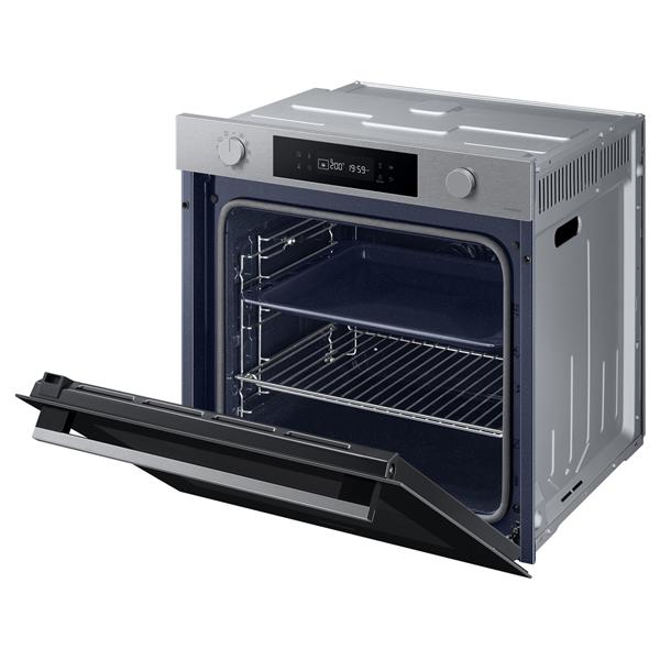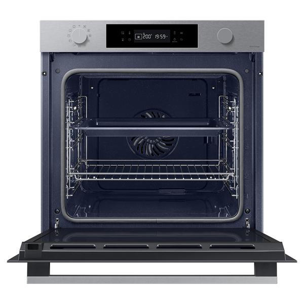 Four pyrolyse Samsung NV7B41307AS Série 4 coloris inox - Ce four encastrable est équipé de commandes électroniques avec double boutons rotatifs et affichage LED, offrant une prise en main simple et précise au quotidien - Il propose 8 modes de cuisson complétés par 3 fonctions spéciales, permettant d’adapter facilement la chaleur aux différents types de plats sans complexité inutile - La connectivité Wi-Fi intégrée associée à l’application SmartThings autorise le contrôle à distance, le préchauffage ou l’arrêt du four, un avantage concret pour gérer la cuisson même hors de la cuisine - Les fonctions de convection Single Fan™, grill, sole ventilée et voûte ventilée couvrent les usages essentiels pour rôtir, gratiner ou cuire de façon homogène sur un seul niveau - La grande cavité de 76 L facilite la préparation de plats familiaux ou de pièces volumineuses, limitant les fournées multiples et le temps passé en cuisine - Le nettoyage par pyrolyse élimine efficacement les résidus de cuisson sans intervention manuelle, pour un entretien réduit après des usages intensifs - L’équipement comprend un éclairage intérieur halogène, une porte à quatre vitres limitant la chaleur extérieure et un programmateur complet avec minuterie, durée et fin de cuisson pour sécuriser les préparations - Une grille et une lèchefrite sont fournies en standard pour couvrir les usages courants de cuisson et de récupération des jus.