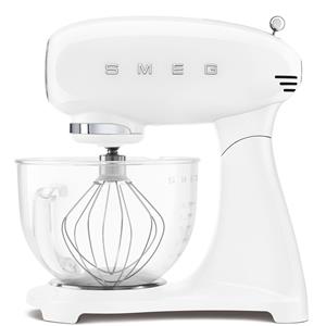 Robot sur socle SMEG SMF05WHEU - Avec son design Années 50 et sa finition blanc brillant, ce robot sur socle entièrement coloré apporte un style iconique tout en étant construit pour enchaîner les recettes sans faiblir - Son moteur à transmission directe de 1000 W délivre une puissance stable et un contrôle précis, même sur des pâtes plus denses - Le mouvement planétaire associé au Steady Mix System assure un mélange homogène et limite les ingrédients qui restent sur les parois, pour un résultat plus régulier sans interruptions - Les 10 vitesses avec contrôle électronique permettent d’ajuster finement la texture, du pétrissage au foisonnement - Le bol en inox de 4,8 L avec poignée offre une capacité confortable pour les gâteaux, la pâte à tarte ou la pâte à pain, tandis que la mise en marche progressive limite les projections - Pratique au quotidien, il est livré avec fouet inox, batteur plat, batteur à bords flexibles en silicone, crochet pétrisseur, bol inox et protection anti-éclaboussures compatible lave-vaisselle, avec couvercle verseur en Tritan Renew - Sécurisé et stable, il intègre un blocage moteur, une protection surcharge et une base antidérapante, avec une sortie frontale pour ajouter des accessoires.
