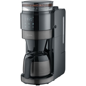 Cafetière filtre SEVERIN KA 4831 avec broyeur intégré et verseuse isotherme conçue pour préparer un café fraîchement moulu à chaque utilisation - La technologie Perfect Grind permet d’ajuster la finesse de mouture sur trois niveaux afin d’adapter l’extraction du café selon les préférences et obtenir un arôme riche et équilibré au quotidien - Son broyeur intégré associé à un réservoir à grains d’environ 200 g permet de profiter du goût authentique du café en grains tout en simplifiant la préparation - L’écran tactile LED offre un réglage intuitif de la quantité de café et de mouture ainsi qu’une fonction minuterie pratique pour programmer la préparation à l’avance - La fonction de désactivation du broyeur permet également d’utiliser du café déjà moulu pour plus de flexibilité selon les habitudes de consommation - Le porte-filtre pivotant avec filtre permanent et système anti-goutte facilite l’utilisation et l’entretien au quotidien - Le réservoir d’eau amovible avec indicateur de niveau simplifie le remplissage et assure un dosage précis - Sa capacité jusqu’à 8 tasses et sa verseuse isotherme permettent de conserver la chaleur du café plus longtemps tout en restant pratique pour un usage familial ou quotidien - Avec sa puissance d’environ 900 W et sa fonction arrêt automatique, cette cafetière allie confort d’utilisation et sécurité dans un design noir et dark inox élégant.