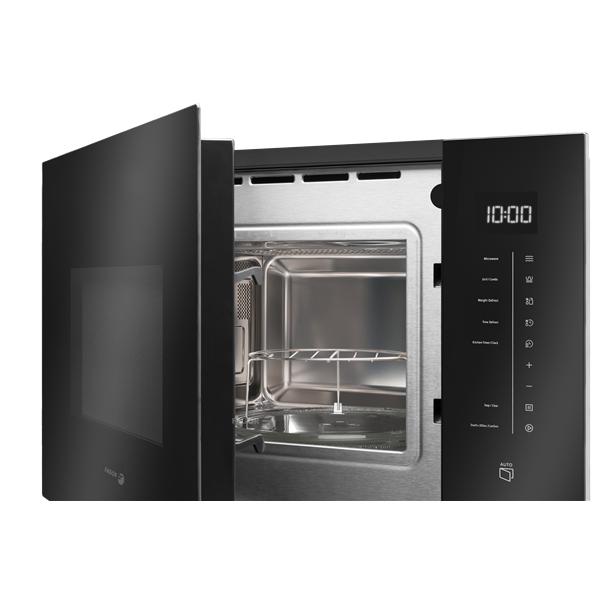 Micro-ondes gril tout intégrable Fagor FMOGI25NS, conçu pour s’intégrer facilement dans une niche de 38 cm, avec une largeur standard de 56 cm, dans une finition noire élégante et discrète. Avec une capacité de 25 litres, il répond aux usages quotidiens en cuisine, que ce soit pour réchauffer, cuire ou gratiner. Il dispose de 5 niveaux de puissance micro-ondes et d’une puissance de 900 W, complétée par un gril quartz de 1 000 W, offrant une vraie polyvalence à l’usage. Les commandes sensitives facilitent la sélection des réglages et assurent une prise en main intuitive. Les 8 programmes de cuisson simplifient la préparation des plats courants, tandis que la fonction Quick Start permet un lancement rapide pour les usages express. Le plateau en verre de 31,5 cm accueille des plats de taille confortable et l’éclairage intérieur améliore la visibilité en cours de cuisson. La porte froide à 4 verres renforce le confort d’utilisation au quotidien. Livré avec une grille, ce modèle combiné permet d’alterner facilement entre cuisson micro-ondes et gril, pour s’adapter aux différentes habitudes culinaires, tout en conservant une intégration soignée dans la cuisine.