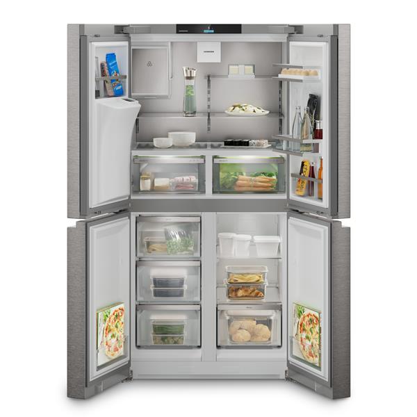 "Réfrigérateur 4 portes Liebherr MBsddi 9028 - Ce modèle 4 portes combine design haut de gamme et technologie avancée pour un confort quotidien optimal - Avec un volume total de 545 L, il offre un vaste espace de stockage réparti entre un réfrigérateur de 214,8 L, une zone BioFresh de 93,9 L et un congélateur de 237 L - Le froid brassé PowerCooling FreshAir garantit une température homogène dans tout l’appareil, tandis que le froid No-Frost du congélateur évite la formation de givre - Les tiroirs BioFresh montés sur rails SoftTelescopic assurent une conservation idéale des fruits, légumes, viandes et poissons à une température proche de 0 °C - Le centre Water & Ice délivre eau fraîche, glace pilée et glaçons limpides à la demande - La zone VarioTemp permet d’ajuster la température de -18 °C à +5 °C pour s’adapter à tous les besoins - L’éclairage LED intérieur et BioFresh assure une visibilité parfaite sur chaque niveau - L’écran tactile TFT couleur 2,4"" permet une régulation électronique intuitive - Compatible Smart Home, ce réfrigérateur connecté se pilote via l’application (SmartDeviceBox fournie) - Son design en inox anti-traces et son faible niveau sonore de 39 dB en font un appareil élégant et silencieux."