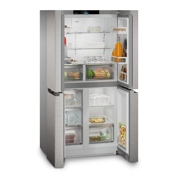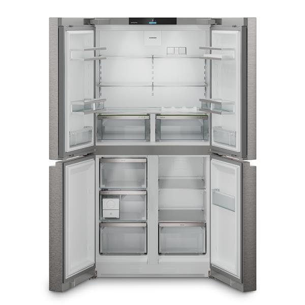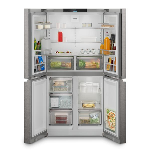 Réfrigérateur 4 portes Liebherr Msdd 9012 - Ce modèle à portes françaises allie élégance et praticité pour un confort d’usage quotidien - Avec un volume total de 576 L, il offre une large capacité répartie entre un réfrigérateur de 356,4 L et un congélateur de 220 L - Le froid brassé PowerCooling FreshAir assure une température homogène dans tout l’appareil grâce à un ventilateur performant et silencieux, tandis que le filtre à charbon actif élimine les odeurs - Les deux tiroirs EasyFresh sur rails télescopiques garantissent la fraîcheur prolongée des fruits et légumes - La technologie VarioTemp permet de régler la température du compartiment inférieur entre -18 °C et +5 °C pour l’utiliser en congélateur ou en zone froide selon les besoins - Le système EasyTwist-Ice permet de produire facilement des glaçons sans raccordement à l’eau, pour des boissons fraîches à tout moment - L’éclairage LED plafonnier assure une visibilité optimale et homogène sur tous les niveaux - Le design intérieur GlassLine avec clayettes et balconnets modulables offre un rangement pratique et élégant - L’écran tactile TFT couleur 2,4'' permet une régulation précise et intuitive - Finition inox anti-trace.