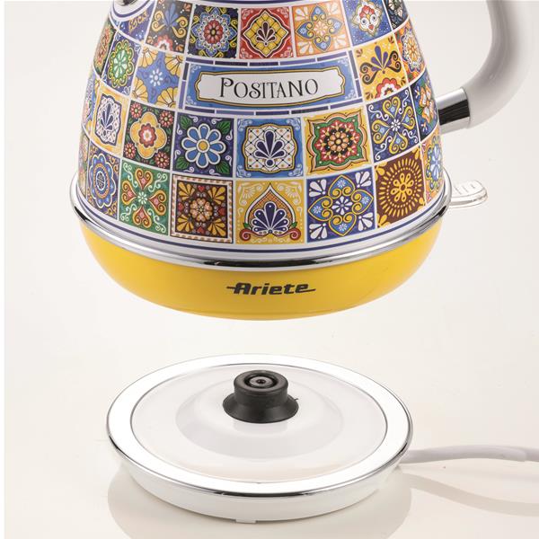 Bouilloire Ariete Positano 1,7 L 2869/0P conçue pour chauffer efficacement l’eau tout en apportant une forte dimension décorative inspirée de l’art méditerranéen - Avec sa capacité de 1,7 litre, elle permet de préparer facilement plusieurs boissons chaudes en une seule utilisation, idéale pour les petits-déjeuners en famille ou les pauses conviviales - Sa puissance de 1850 à 2200 W assure une montée en température rapide, limitant le temps d’attente au quotidien - Le corps en acier inoxydable garantit une bonne robustesse et une excellente longévité, tout en facilitant l’entretien - L’indicateur de niveau d’eau visible aide à ajuster précisément la quantité nécessaire, pour un usage plus maîtrisé - Le filtre à tisane amovible améliore le confort des amateurs de thés et d’infusions en retenant efficacement les résidus - La base sans fil pivotante à 360° facilite la prise en main, quel que soit le sens de positionnement, tandis que l’arrêt automatique renforce la sécurité lors de l’ébullition - Son décor Positano aux motifs colorés transforme un appareil fonctionnel en véritable objet de caractère dans la cuisine.