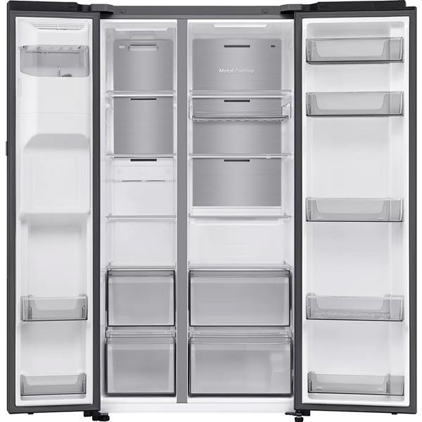 Réfrigérateur américain Samsung RS80F64KEF - Avec sa capacité totale de 640 L, ce modèle offre un vaste espace pour stocker vos aliments en toute sérénité - Le froid ventilé intégral Multi-Flow garantit une température homogène dans chaque recoin et met fin à la corvée du dégivrage - Le revêtement Metal Cooling en fond de cavité assure une conservation optimale et un retour rapide au froid après chaque ouverture - L’ouverture automatique des portes, déclenchée par un simple contact, facilite l’accès aux compartiments même les mains prises - L’assistant vocal Bixby intégré permet de piloter les fonctions de l’appareil à la voix, tandis que la connectivité Wi-Fi via SmartThings vous offre un contrôle à distance pratique - Le distributeur d’eau, de glaçons et de glace pilée apporte un vrai confort au quotidien - Les clayettes en verre trempé, les balconnets et les tiroirs à légumes offrent un rangement flexible et robuste - L’éclairage LED assure une visibilité parfaite tout en limitant la consommation - Le compresseur AI Inverter ajuste la puissance selon les besoins pour une efficacité et un silence de fonctionnement exemplaires - Pose-libre, ce modèle noir mesure 1784 mm de haut, 912 mm de large et 726 mm de profond, alliant élégance et technologie.