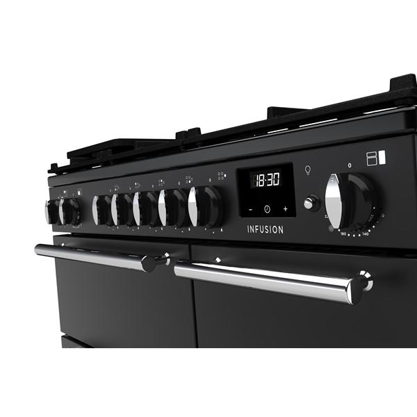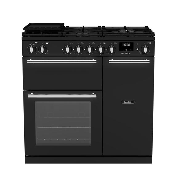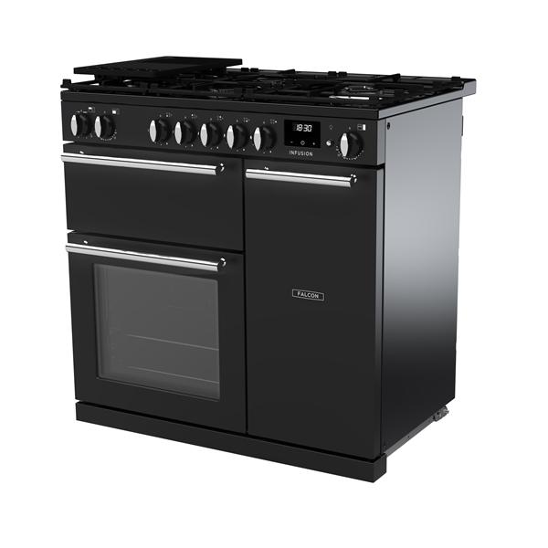 Piano de cuisson Falcon INFUSION gaz INF90DFPCBL/CM-E1 - En 90 cm, ce piano mixte combine une table gaz 5 brûleurs (puissance totale 11,4 kW) et une plancha incluse mi-lisse mi-nervurée, idéale pour varier les cuissons et enchaîner les repas conviviaux - Côté four, il propose un four multifonction programmable de 80 L avec rails télescopiques et parois catalytiques pour faciliter l’entretien au quotidien - Un second four chaleur tournante de 67 L avec parois émaillées permet de gérer plusieurs recettes en parallèle, sans compromis sur la régularité de cuisson - Un grill séparé de 29 L avec plateau coulissant complète l’ensemble pour gratiner, toaster et réchauffer rapidement - L’écran LED blanc tactile avec affichage des minutes simplifie les réglages - Les portes haut de gamme magnétiques et la plinthe renforcent la sensation de produit robuste et soigné - Coloris charbon avec finition chrome.
