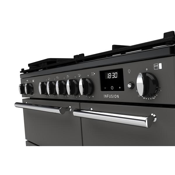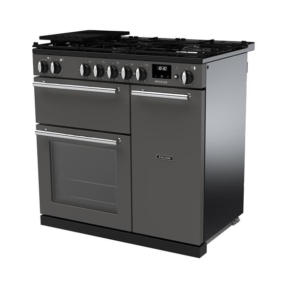 Piano de cuisson Falcon INFUSION gaz INF90DFPSLT/CM-E1 - En 90 cm, ce piano mixte combine une table gaz 5 brûleurs (puissance totale 11,4 kW) et une plancha incluse mi-lisse mi-nervurée, idéale pour varier les cuissons et enchaîner les repas conviviaux - Côté four, il propose un four multifonction programmable de 80 L avec rails télescopiques et parois catalytiques pour faciliter l’entretien au quotidien - Un second four chaleur tournante de 67 L avec parois émaillées permet de gérer plusieurs recettes en parallèle, sans compromis sur la régularité de cuisson - Un grill séparé de 29 L avec plateau coulissant complète l’ensemble pour gratiner, toaster et réchauffer rapidement - L’écran LED blanc tactile avec affichage des minutes simplifie les réglages - Les portes haut de gamme magnétiques et la plinthe renforcent la sensation de produit robuste et soigné - Coloris ardoise avec finition chrome.