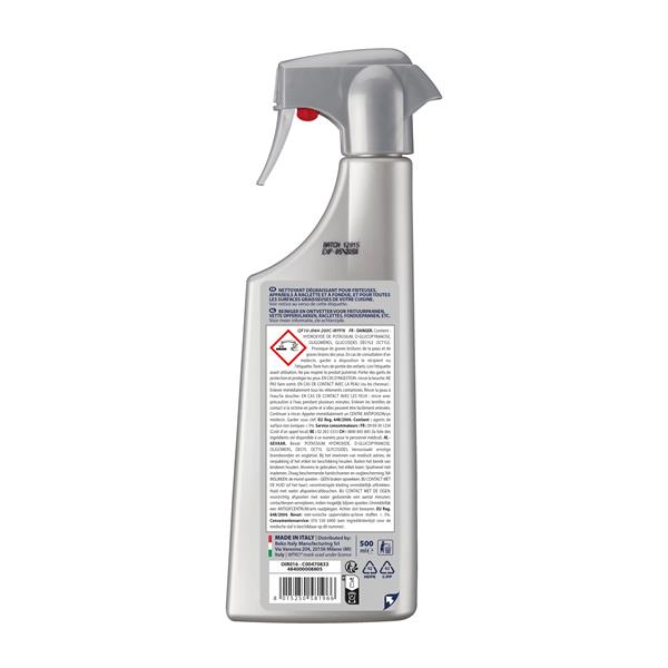 Nettoyant pour friteuses Wpro OIR016 - Ce nettoyant dégraissant est conçu pour éliminer efficacement les résidus de graisse tenaces sur les friteuses, appareils à raclette, à fondue et plus largement sur toutes les surfaces graisseuses de la cuisine - Sa formule est particulièrement adaptée aux surfaces en acier inoxydable, qu’elle nettoie en profondeur tout en respectant leur aspect d’origine - Utilisé sur une surface tiède autour de 40 °C, il agit rapidement pour décoller les graisses incrustées et faciliter le rinçage à l’eau claire - En plus de l’action nettoyante, il dépose une couche protectrice qui contribue à limiter le vieillissement de l’inox et à préserver son éclat dans le temps - Son format spray permet une application précise et homogène à environ 20 cm, sans surdosage ni coulures inutiles - Ce produit convient à un usage régulier pour maintenir un niveau d’hygiène élevé sur les équipements de cuisson sollicités intensivement - Il est à noter qu’il ne doit pas être utilisé sur l’aluminium ou ses alliages afin de garantir une utilisation conforme et sécurisée - Le flacon de 500 ml offre un bon équilibre entre autonomie et maniabilité, aussi bien pour un usage domestique que pour des environnements exigeants.