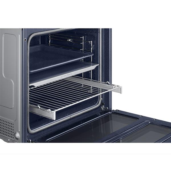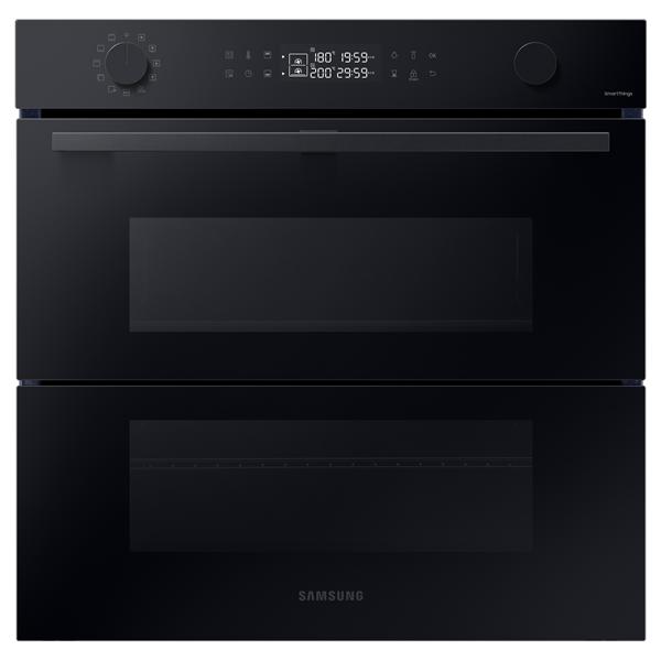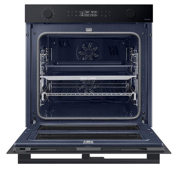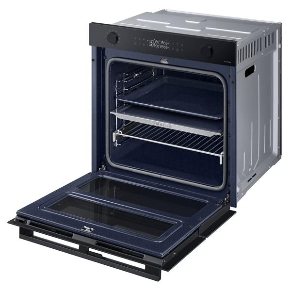 Four pyrolyse Samsung NV7B4550VAK Série 4 Bespoke coloris verre noir - Ce four encastrable est doté de commandes électroniques avec double boutons rotatifs et affichage LED, garantissant un réglage clair et précis des paramètres de cuisson - Il propose 10 modes de cuisson exploitables en cavité entière, cavité supérieure, cavité inférieure ou en mode Twin Convection™, afin d’adapter l’appareil au volume réel de plats préparés - La connectivité Wi-Fi associée à l’application SmartThings permet de contrôler le four à distance, de lancer un préchauffage ou de vérifier l’état de la cuisson sans rester devant l’appareil - Les fonctions Twin Convection™, cuisson sous-vide et vapeur simple répondent à des usages exigeants comme la cuisson simultanée de recettes différentes, la préservation du moelleux des viandes ou l’obtention de pains et pâtisseries à texture maîtrisée - La technologie Dual Cook Flex™ avec ouverture à deux portes permet d’accéder à la cavité supérieure sans perturber la cuisson inférieure, limitant les pertes de chaleur et améliorant la stabilité thermique - La grande capacité de 76 L assure une réelle polyvalence pour les repas familiaux ou les préparations volumineuses tout en conservant une bonne efficacité énergétique - L’équipement comprend un éclairage halogène, une porte à quatre vitres pour une meilleure isolation thermique, un programmateur complet avec minuterie, durée et fin de cuisson, ainsi qu’un rail télescopique à ouverture partielle pour manipuler les plats en sécurité - Les accessoires fournis incluent un séparateur de cavité, un plateau vapeur, une grille et une lèchefrite couvrant les usages courants et les cuissons spécifiques.