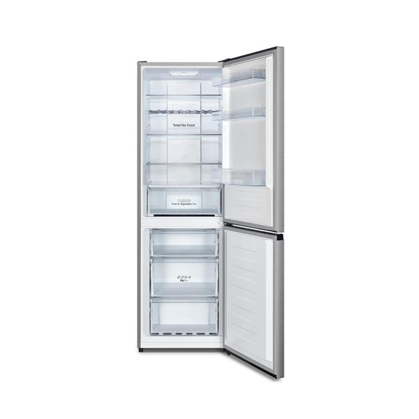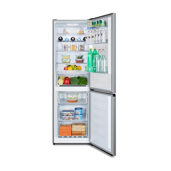 Réfrigérateur combiné pose-libre Hisense RB395N4BCE coloris métal brillant offrant une capacité totale de 304 L, répartie entre 207 L pour le réfrigérateur et 97 L pour le congélateur - Ce modèle utilise un système de froid ventilé (no frost) pour garantir une réfrigération sans givre, ce qui évite l’accumulation de glace et améliore la conservation des aliments - La technologie Multi Air Flow permet une circulation homogène de l’air réfrigéré dans tout l’appareil, assurant une température constante à chaque étage - Le contrôle électronique situé en façade permet de régler facilement la température et d’activer des fonctions telles que le mode éco et la super congélation - Le réfrigérateur est équipé de trois clayettes en verre sécurit, de trois balconnets et d’un compartiment à légumes, ainsi que d’un éclairage LED pour une visibilité optimale - La porte s’ouvre à 90° sans débord, permettant une installation flexible contre un mur tout en offrant un accès complet aux tiroirs - Le congélateur dispose d’un tiroir et d’un bac à glaçons, avec un pouvoir de congélation de 6 kg/24h et une autonomie de 10 heures en cas de coupure de courant - Les poignées intégrées et les pieds ajustables à l’avant, accompagnés des roulettes à l’arrière, facilitent le déplacement et l’installation - Avec une classe énergétique E et un niveau sonore de 39 dB(A), ce combiné offre des performances écoénergétiques et silencieuses.