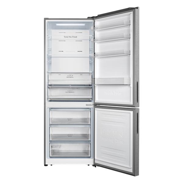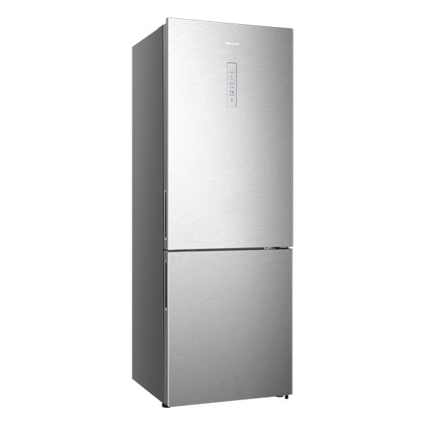 Réfrigérateur combiné pose-libre Hisense RB645N4BCE largeur 70 cm coloris inox offrant une capacité totale de 495 L, répartie entre 345 L pour le réfrigérateur et 150 L pour le congélateur - Ce réfrigérateur utilise un système de froid ventilé (no frost) pour éviter l'accumulation de glace, garantissant ainsi une conservation optimale des aliments sans givre - La technologie Micro Vents permet une distribution homogène de l’air froid sur tous les étages, assurant un refroidissement rapide et constant, même avec un réfrigérateur plein - Le compartiment fraîcheur est conçu pour maintenir les viandes et poissons à une température idéale pour prolonger leur fraîcheur - Le contrôle tactile en façade facilite l'ajustement des températures et l'activation des modes réfrigération rapide et congélation rapide - L’éclairage LED progressif permet de mieux voir l'intérieur tout en étant économe en énergie - Le réfrigérateur est équipé de deux clayettes en verre, de quatre balconnets et d’un bac à fruits et légumes - Le congélateur, avec trois tiroirs et un bac à glaçons, offre un espace de congélation spacieux et bien organisé - Les poignées intégrées et les roulettes arrière, accompagnées de pieds ajustables à l'avant, facilitent le déplacement et l’installation - Avec une classe énergétique E et un niveau sonore de seulement 39 dB(A), ce modèle offre des performances efficaces et silencieuses.