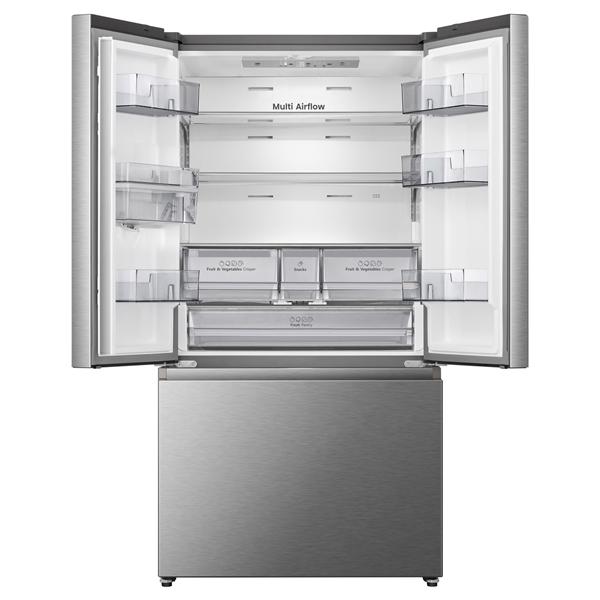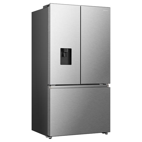 Réfrigérateur 2 portes + 1 tiroir Hisense RF815N4SWSE coloris inox anti-traces avec une capacité totale de 635 L, dont 439 L pour le réfrigérateur et 196 L pour le congélateur - Ce réfrigérateur utilise un système de froid ventilé (no frost) avec la technologie Multi Air Flow qui distribue l’air froid de manière homogène dans les colonnes pour un refroidissement rapide et constant - Le distributeur d’eau en façade permet d’avoir de l’eau fraîche à tout moment, évitant ainsi d'encombrer l’intérieur du réfrigérateur avec des bouteilles - Le contrôle LED intérieur permet de gérer facilement les réglages de température et d'activer des fonctions pratiques comme le mode réfrigération rapide et congélation rapide - L’éclairage LED assure une visibilité optimale tout en étant économe en énergie - Le réfrigérateur est équipé de deux clayettes en verre, de deux bacs à légumes, d’un compartiment fraîcheur pour maintenir vos viandes et poissons à la température idéale, et de trois balconnets - Le congélateur est composé d'un tiroir et d’un tiroir intermédiaire, offrant une capacité de congélation de 7 kg/24h et une autonomie de 14 heures en cas de coupure de courant - Le réfrigérateur est extrêmement silencieux avec un niveau sonore de 37 dB, ce qui le rend adapté à une cuisine ouverte - Ce modèle est également doté de poignées intégrées pour un design épuré et moderne.