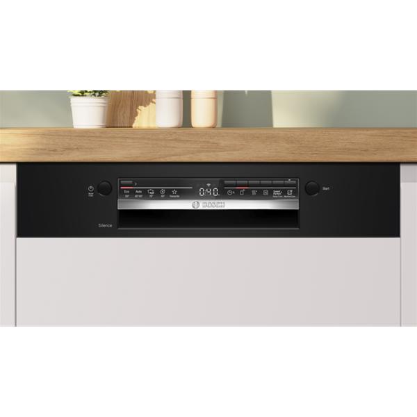 Lave-vaisselle intégrable Bosch SMI2HTB06E Série 2 largeur 60 cm avec bandeau noir - Il dispose de 5 programmes dont le programme Express 65 °C qui permet d’obtenir une vaisselle propre et sèche en seulement 60 minutes, pratique pour un repas imprévu ou un besoin rapide au quotidien - Les paniers Vario offrent une organisation modulable avec un panier supérieur réglable en hauteur, deux supports pour tasses, un panier inférieur avec deux rangées de picots rabattables et un panier à couverts, facilitant le chargement des assiettes volumineuses comme des verres fragiles - La cuve polinox assure robustesse et durabilité pour un usage intensif - L’échangeur thermique protège la vaisselle des chocs thermiques et limite les variations de température, préservant ainsi les verres et les matériaux délicats - L’AquaSensor adapte automatiquement la consommation d’eau selon le degré de salissure, ce qui optimise les ressources à chaque cycle - L’option Séchage Extra améliore le résultat sur les plastiques, évitant de devoir essuyer en fin de programme - Il est équipé d’un départ différé de 1 à 24 h et d’un affichage du temps restant en façade pour mieux planifier les cycles - La connectivité WiFi via Home Connect permet le contrôle et le diagnostic à distance ainsi que des fonctions complémentaires comme Silence à la demande - Son moteur EcoSilence Drive assure un fonctionnement fiable et un niveau sonore maîtrisé de 46 dB - Cet appareil est intégrable : Il est livré sans habillage ni porte décorative, afin de vous permettre de l'assortir au mobilier et à la couleur de votre cuisine.