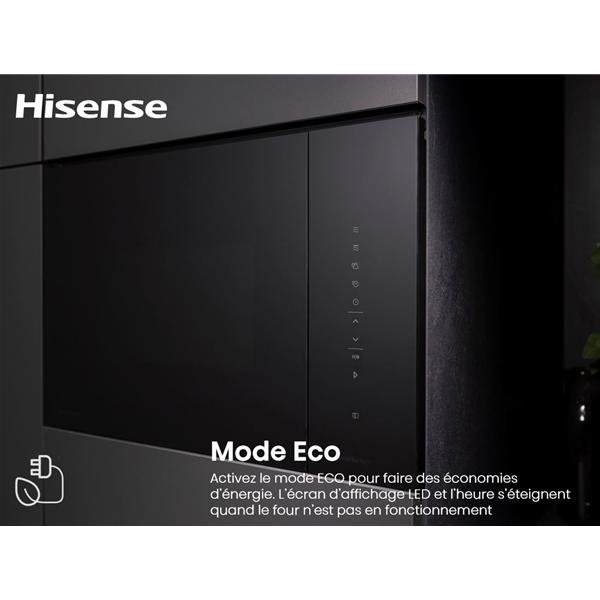 Micro-ondes gril intégrable Hisense BIM325GI63DBG hauteur de niche 380-382 mm largeur de niche 560-568 mm coloris noir porte full black - Il propose 5 niveaux de puissance de 150 à 900 W permettant d’adapter précisément le réchauffage, la cuisson ou la décongélation selon la nature des aliments - Les commandes électroniques avec affichage LED blanc SmartDisplay assurent un réglage simple et lisible de la durée, des fonctions et de l’heure pour un pilotage précis au quotidien - Les programmes incluent la décongélation automatique avec réglage au poids ou à la durée, la fonction StepBake pour enchaîner deux modes de cuisson successifs et le nettoyage AquaClean facilitant l’entretien de la cavité - La technologie InverterTech maintient une température constante et maîtrisée afin d’éviter les surcuissons, d’obtenir des résultats plus homogènes et de préserver la texture des plats - Le gril Quartz d’une puissance de 1200 W permet de gratiner, dorer ou finaliser une préparation avec efficacité, idéal pour apporter du croustillant en fin de cuisson - L’ouverture tactile 1 Touch simplifie l’accès à la cavité par une simple pression en façade, un confort appréciable en intégration - Le plateau tournant en verre de 31,5 cm accepte facilement de grands plats familiaux - La cavité InoxTerior en inox favorise la durabilité et facilite le nettoyage - L’ouverture latérale automatique par commande tactile offre une manipulation fluide et sécurisée au quotidien.
