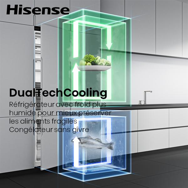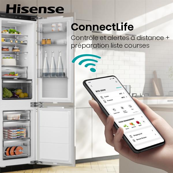 Réfrigérateur combiné encastrable Hisense RB3B250SAWE - Avec une capacité totale de 252 L, dont 176 L pour la partie réfrigérateur et 76 L pour le congélateur, ce modèle offre un volume bien adapté à un foyer recherchant un stockage équilibré - Le froid ventilé No Frost est présent aussi bien dans le réfrigérateur que dans le congélateur, pour éviter la formation de givre et conserver des aliments mieux protégés au quotidien - La technologie Multi Air Flow assure une répartition homogène du froid, tandis que Dual Tech Cooling limite le mélange des odeurs entre les deux compartiments pour préserver la fraîcheur des produits sensibles - Le système MetalTechCooling permet une descente en température plus rapide après ouverture de porte, pratique lors des courses - La zone ConvertActive est convertible de -24 °C à +3 °C pour adapter l’espace selon les besoins, congélation ou stockage frais - Les modes Eco, réfrigération rapide et congélation rapide facilitent la gestion des variations de charge - L’équipement intérieur comprend un éclairage LED progressif, deux clayettes en verre, une clayette porte-bouteilles dédiée, un tiroir zone fraîcheur et un tiroir fruits et légumes à humidité contrôlée avec traitement antibactérien - Le congélateur, convertible, dispose de trois tiroirs pour organiser facilement les surgelés - La régulation se fait par contrôle LED tactile sous verre, avec alarme porte ouverte pour plus de sécurité - Ce modèle encastrable est prévu pour une niche de 1776 mm de hauteur avec fixation par pantographes - Cet appareil est intégrable. Il est livré sans habillage ni porte décorative, afin de vous permettre de l'assortir au mobilier et à la couleur de votre cuisine.