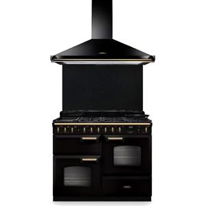 Pack piano de cuisson Falcon Classic Deluxe NGC CLDL90DFPGBL/AB-FP noir finition laiton avec hotte et crédence assorties - Ce piano mixte gaz et électrique 90 cm associe deux grands fours à chaleur tournante de 80 L et 67 L pour cuire simultanément plusieurs plats avec une diffusion homogène de la chaleur, idéale pour les repas familiaux comme pour les grandes tablées - Le four multifonction gauche intègre un Handyrack suspendu à la porte et des rails télescopiques qui facilitent la manipulation des plats lourds en toute sécurité - Le four droit dispose d’un indicateur de température en façade pour un contrôle visuel immédiat pendant la cuisson - Un gril séparé avec plateau coulissant et grille 4 positions permet de gratiner ou saisir rapidement sans mobiliser les fours principaux - La table gaz 5 brûleurs dont un brûleur multi-couronne spécial wok offre la puissance nécessaire aux cuissons vives et précises, de la sauce délicate au sauté minute - La plancha semi-lisse/semi-nervurée et le support wok fournis élargissent les possibilités culinaires au quotidien - Les supports en fonte semi-brillante assurent stabilité et robustesse pour une utilisation intensive - L’écran LED blanc tactile avec minuterie apporte confort et précision dans la gestion des temps de cuisson - La hotte 90 cm en mode évacuation ou recyclage avec 4 vitesses, filtres métalliques et filtres à charbon inclus, contribue à maintenir un air plus sain dans la cuisine - La crédence coordonnée protège efficacement le mur des éclaboussures tout en structurant l’espace cuisson avec élégance.