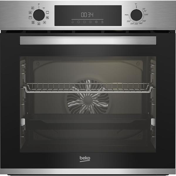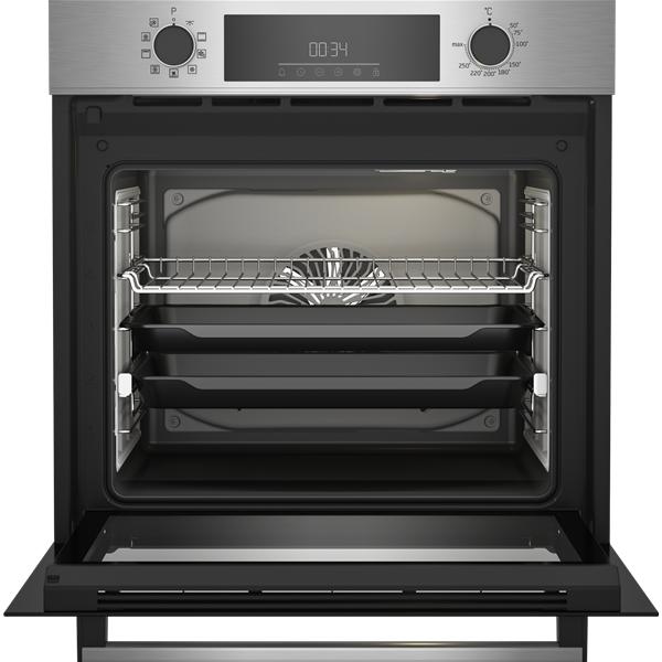 Four catalyse Beko BBIM12300XCE série b300 coloris inox - Commandes mécaniques avec boutons rotatifs et afficheur sensitif blanc assurant un réglage simple et lisible au quotidien - Neuf programmes de cuisson électroniques permettant d’adapter précisément la cuisson selon les recettes et les habitudes - Fonctions chaleur tournante Eco, gril fort, pizza, sole ventilée et décongélation offrant des usages variés allant de la cuisson homogène sur plusieurs niveaux à la remise en température douce des aliments - Les parois catalytiques latérales et au fond absorbent automatiquement les projections de graisse pendant la cuisson, limitant l’entretien manuel et réduisant la consommation énergétique liée au nettoyage - La chaleur pulsée 3D favorise une répartition régulière de la température dans la cavité pour des résultats constants, même lors de cuissons simultanées - L’équipement comprend un éclairage intérieur en voûte offrant une visibilité claire sur les plats, une porte à double vitrage limitant la montée en température extérieure, des gradins amovibles sur cinq niveaux pour ajuster facilement la hauteur de cuisson et un rail télescopique à un niveau facilitant l’enfournement et le retrait des plats en toute sécurité - La contre-porte plein verre amovible simplifie l’entretien courant et permet un accès direct à l’intérieur du four - Les accessoires fournis incluent une lèchefrite standard et une grille polyvalente adaptées aux usages quotidiens et aux différents modes de cuisson.
