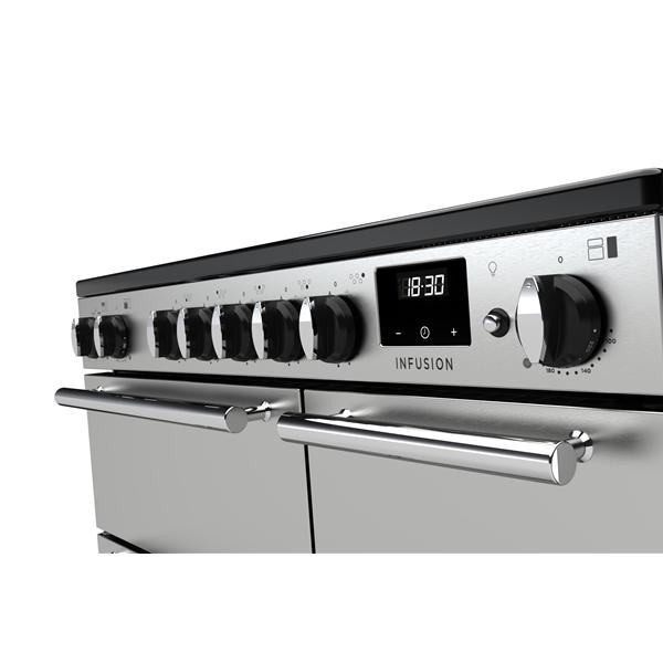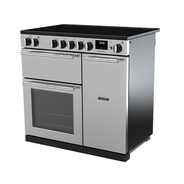 Piano de cuisson Falcon INFUSION induction INF90EISTST/CM-E1 - En 90 cm, ce piano à induction propose 5 foyers avec fonction boost pour saisir vite, faire mijoter précisément et enchaîner les cuissons sans perte de puissance - La puissance totale du plan atteint 7,36 kW, avec un branchement prévu en monophasé 32,17 A ou en triphasé 3 x 16 A selon l’installation - Côté fours, le four multifonction programmable de 80 L est équipé de rails télescopiques pour manipuler les plats plus sereinement, et ses parois catalytiques aident à limiter l’entretien - Le four droit de 67 L (parois émaillées) apporte une cuisson homogène, pratique pour gérer plusieurs plats en parallèle - Un grill séparé de 29 L avec plateau coulissant complète l’ensemble pour gratiner et toaster rapidement - Portes haut de gamme magnétiques, bandeau de commandes coordonné, plinthe et écran LED blanc tactile avec affichage des minutes pour une prise en main simple - Finition inox et chrome.