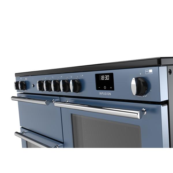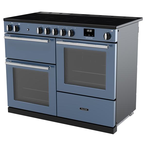 Piano de cuisson Falcon INFUSION induction OC INFO110EIPSTB/CM-E1 -En 110 cm, ce piano à induction offre 5 foyers avec fonction Boost pour gagner en réactivité, du mijotage précis aux saisies rapides - La puissance totale du plan atteint 7,36 kW, avec un branchement prévu en monophasé 32,17 A ou en triphasé 3 x 16 A selon votre installation - Côté fours, vous disposez de 2 cavités de 80 L avec rails télescopiques, dont 1 four multifonction programmable pour enchaîner les cuissons avec plus de confort - Les deux fours sont classés A et montent jusqu’à 240 °C, pratique pour cuisiner sur plusieurs niveaux - Le nettoyage est facilité par des parois catalytiques dans les 2 fours - Un grill séparé de 29 L avec plateau coulissant complète l’ensemble pour gratiner, toaster, réchauffer ou décongeler sans monopoliser les fours - Écran LED blanc tactile avec affichage des minutes, portes haut de gamme magnétiques triple vitrage, plinthe et tiroir de pousse - Coloris roche bleue avec finition chrome.
