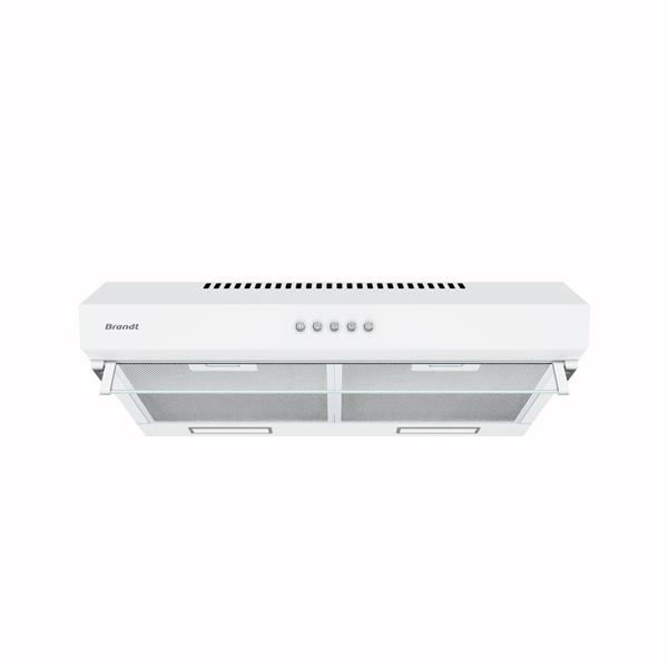 Hotte visière Brandt BHC4611W - Elle propose 3 vitesses pour adapter la puissance d’aspiration à vos besoins - Ses commandes mécaniques par touches assurent une utilisation simple et intuitive - Elle offre des fonctions essentielles comme l’éclairage indépendant, la mise en marche/arrêt et la sélection des vitesses - Équipée de 2 filtres à graisse en aluminium lavables à la main, elle est livrée avec un filtre à charbon de série (référence CF180) qui permet une utilisation immédiate en mode recyclage - L’éclairage LED, composé de 2 lampes d’une puissance totale de 4 W, garantit un confort visuel optimal tout en limitant la consommation énergétique - Le diamètre de sortie est de 120 mm, accompagné d’un clapet anti-retour et d’un déflecteur pour plus d’efficacité - Finition blanc.
