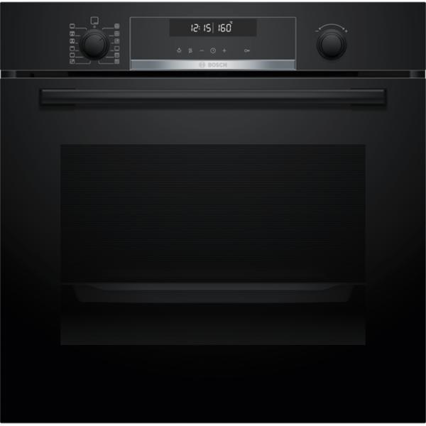 Four pyrolyse Bosch HBG578EB3 Série 6 coloris noir - Il est équipé de commandes par boutons rotatifs escamotables associées à un écran LCD à affichage blanc pour une utilisation simple et lisible au quotidien - Il propose 30 programmes automatiques AutoPilot ainsi que 10 modes de cuisson couvrant les usages essentiels comme la chaleur tournante 3D, le gril, la position pizza ou encore la cuisson basse température - La fonction Air Fry permet de cuire des aliments croustillants avec peu d’huile, idéale pour une cuisine plus saine sans sacrifier le goût - La chaleur tournante 3D assure une cuisson homogène sur plusieurs niveaux, ce qui permet de préparer plusieurs plats simultanément sans mélange de saveurs - Le nettoyage pyrolytique élimine efficacement les graisses sans effort, complété par une assistance hydrolyse pour un entretien régulier plus rapide - Le préchauffage Booster réduit le temps d’attente et améliore le confort d’utilisation au quotidien - Il dispose d’un équipement complet avec rails télescopiques sur un niveau, éclairage halogène, porte froide à 4 vitres et système SoftMove pour une ouverture et fermeture douce - La cavité de 71 litres offre une grande capacité adaptée aux familles et aux cuissons volumineuses - Les accessoires fournis comprennent une grille, une lèchefrite et une plaque Air Fry pour varier les préparations dès la première utilisation.