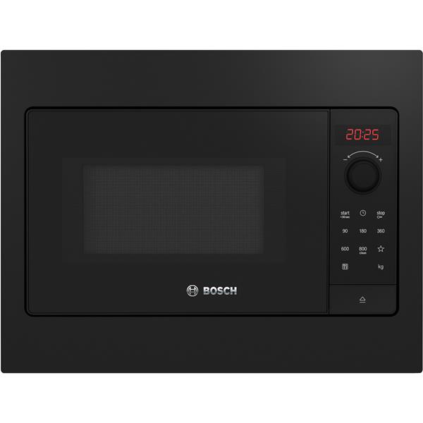 Micro-ondes solo intégrable Bosch BFL523MB4 Série 2 Noir - Hauteur niche 38 cm - Largeur niche 50 cm - Avec ses 5 niveaux de puissance allant de 90 à 800 W, ce modèle s’adapte à toutes vos préparations - Les commandes électroniques combinant touches tactiles, boutons rotatifs et écran LED offrent une utilisation intuitive et précise - Les 7 programmes automatiques AutoPilot simplifient la cuisson, dont 4 dédiés à la décongélation et 3 à la cuisson micro-ondes, avec en plus un bouton Favoris et la fonction Quick Start pour ajouter 30 secondes d’un simple geste - Le plateau tournant en verre de 27 cm assure une répartition homogène de la chaleur - La cavité gris laqué bénéficie d’un éclairage LED basse consommation et du programme de nettoyage hydrolyse pour limiter les efforts d’entretien - La porte à ouverture latérale avec charnières à gauche permet un accès facile même dans un meuble haut - Côté sécurité, l’appareil intègre un verrouillage enfants, une coupure automatique et un ventilateur de refroidissement pour une tranquillité totale.