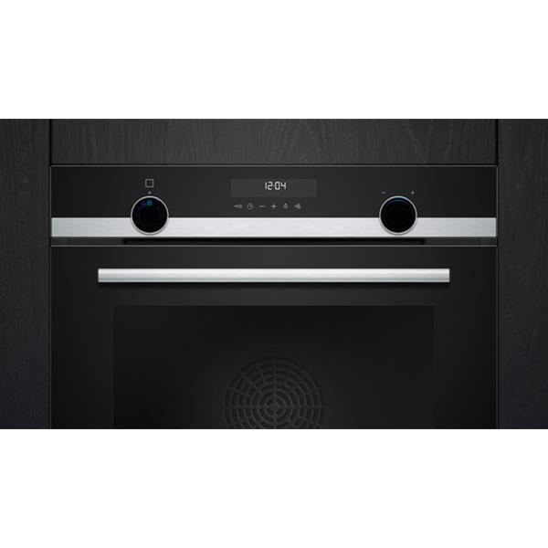 Four pyrolyse Siemens HB578HBS7 iQ500 Inox - Ce four encastrable de 71 L se distingue par sa porte tiroir qui coulisse en douceur pour un accès simplifié à la cavité, idéal dans les configurations de cuisine à hauteur ergonomique - Son design premium mêle verre noir et inox brossé, sublimé par deux boutons rétroéclairés lightControl et un écran LCD clair - Il propose 8 modes de cuisson dont air pulsé 3D pour une répartition homogène de la chaleur, convection naturelle, gril air pulsé, gril grande surface, position pizza, chaleur douce hotAir, cuisson basse température et coolStart pour les plats surgelés - La connectivité Home Connect permet de piloter le four à distance depuis un smartphone ou à la voix via un assistant vocal - Côté confort, il intègre un départ automatique, une préconisation de température, un booster de préchauffage, une fonction Sabbat et un contrôle optique de la montée en température - Son nettoyage pyrolyse activeClean simplifie l’entretien en éliminant les résidus à haute température - Niveau équipement, on retrouve une cavité émaillée anthracite, une porte froide 4 vitres, un ventilateur de refroidissement et une poignée inox robuste - Les accessoires inclus sont une grille, une lèchefrite et une tôle de cuisson émaillée - Sécurité renforcée : verrou électronique, sécurité enfants, coupure automatique et indicateur de chaleur résiduelle.