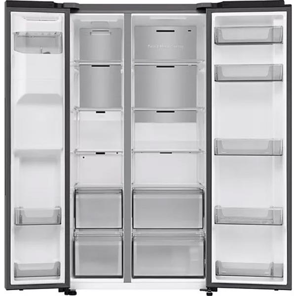 Réfrigérateur américain Samsung RS70F66KCT - Avec sa capacité généreuse de 634 L, il offre un volume idéal pour les familles nombreuses - Le froid ventilé plus, doté de la technologie Twin Cooling, régule indépendamment les deux cavités afin de maintenir un taux d’humidité optimal et préserver plus longtemps la fraîcheur des aliments - Le revêtement Metal Cooling en fond de cavité assure une température homogène et une restitution rapide du froid après chaque ouverture de porte - La zone convertible Smart Conversion propose cinq modes pratiques pour ajuster l’espace selon vos besoins : double réfrigérateur, mini réfrigérateur, vacances ou congélateur classique - Les clayettes en verre trempé, les cinq balconnets et les tiroirs à légumes garantissent un rangement modulable et solide - Le distributeur d’eau, de glaçons et de glace pilée offre un confort d’utilisation quotidien - L’éclairage LED assure une visibilité parfaite tout en consommant peu d’énergie - Les commandes électroniques internes et la connectivité Wi-Fi via SmartThings permettent de piloter la température et le mode AI Energy, qui optimise le fonctionnement du compresseur AI Inverter pour réduire la consommation - Pose-libre, ce modèle Platinum Inox associe design, efficacité et technologie.