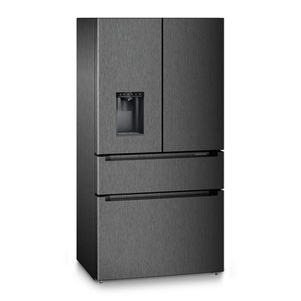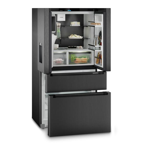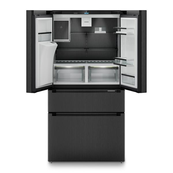 Réfrigérateur combiné portes françaises Liebherr MBbsdi 9528 coloris BlackSteel offrant une capacité totale de 538 litres dont 308 L pour le réfrigérateur (BioFresh inclus) et 230 L pour le congélateur - La réfrigération bénéficie du système PowerCooling qui répartit l’air froid de manière homogène dans toute la cavité tandis que le congélateur dispose d’un compartiment **** dédié à la congélation et à la conservation longue durée des aliments - Les tiroirs BioFresh maintiennent une température proche de 0 °C pour préserver plus longtemps la fraîcheur des fruits, légumes, viandes et produits laitiers, tandis que la zone VarioTemp peut être réglée entre -18 °C et +5 °C pour transformer l’espace selon les besoins, par exemple en zone de réfrigération supplémentaire lors de réceptions ou pour adapter le stockage des boissons et préparations - Water&Ice Center avec MoodLight: une solution design et pratique. Fournit de l'eau fraîche, des glaçons et de la glace pilée à toute heure. Permet également de choisir la quantité en fonction du contenant. Le distributeur est éclairé avec le MoodLight (désactivable), idéal pour ambiancer la cuisine - La connectivité SmartDeviceBox intégrée permet l’intégration dans un environnement Smart Home et facilite le pilotage de l’appareil, tandis que les alarmes visuelle et sonore signalent toute anomalie de porte ou de température afin de sécuriser la conservation des aliments - L’équipement intérieur comprend un éclairage LED au plafond et dans les tiroirs BioFresh, des balconnets GlassLine avec socle en verre, un range-bouteilles modulable, un bac à œufs variable et un beurrier pour une organisation claire et pratique du réfrigérateur - La régulation électronique s’effectue via un écran couleur TFT 2,4 pouces placé derrière la porte avec commandes Touch & Swipe et affichage digital des températures du réfrigérateur et du congélateur - Appareil pose-libre finition BlackSteel avec façade et côtés coordonnés offrant un design robuste et contemporain.
